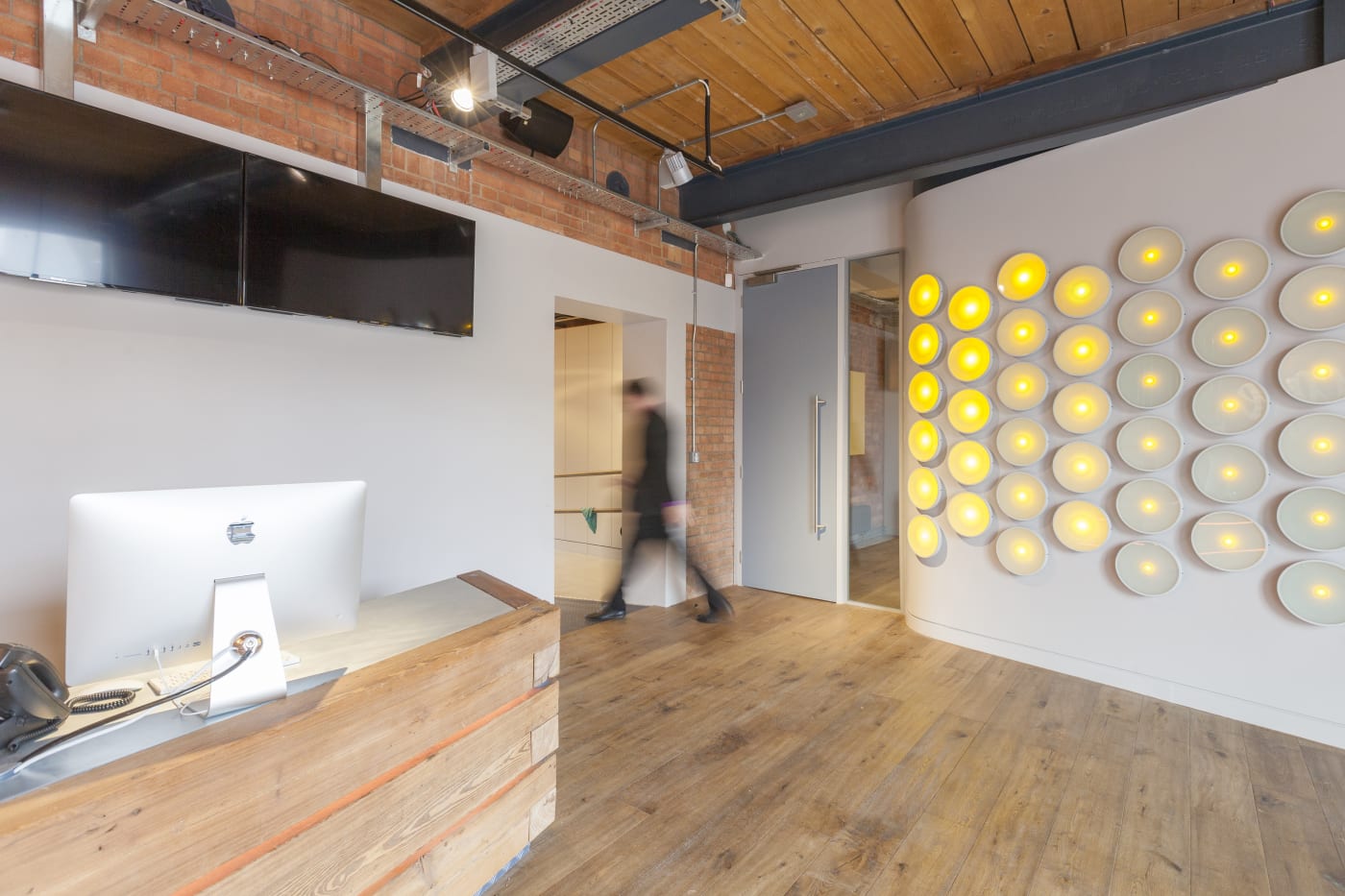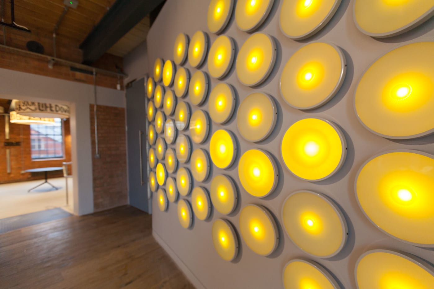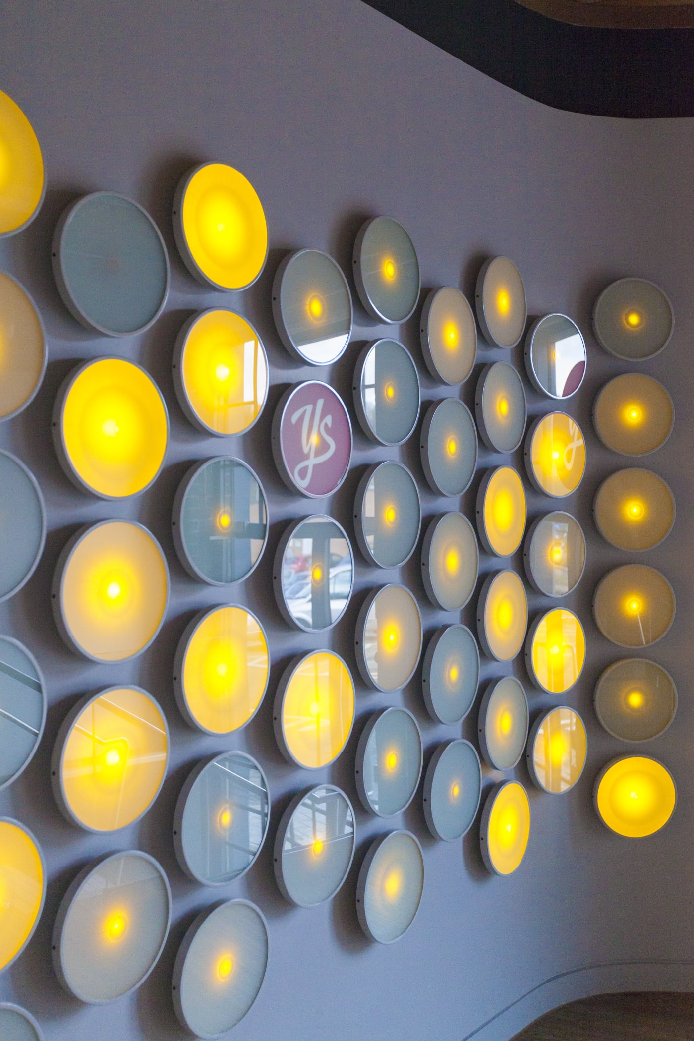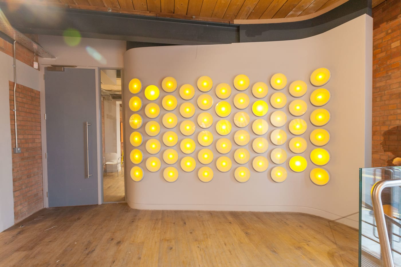 Bute Mills is an interactive, permanent artwork, designed for a charity called Youthscape, which helps and encourages young people. It consists of an array of 61 mechanical dynamic pixels, built from salvaged car parts from Vauxhall, the main sponsor of this project. The pixels respond to movements in front of the artwork, reciprocating the activity in the lobby of the building, resulting in an ever-changing wall of light.